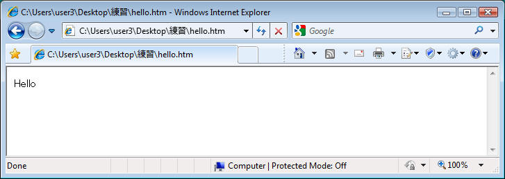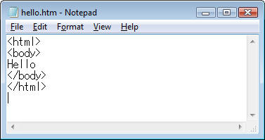 メモ帳等のテキスト エディタを起動して以下のコードを入力し、ファイル名 hello.htm で保存してください。