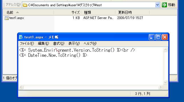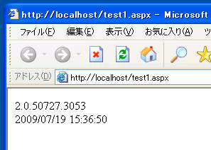 ブラウザに http://localhost/test1.aspx と入力すれば先ほど作成した .aspx ページが表示できます。